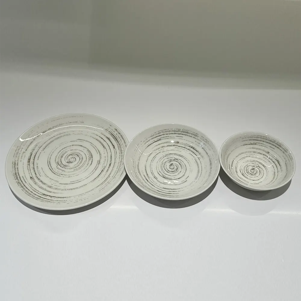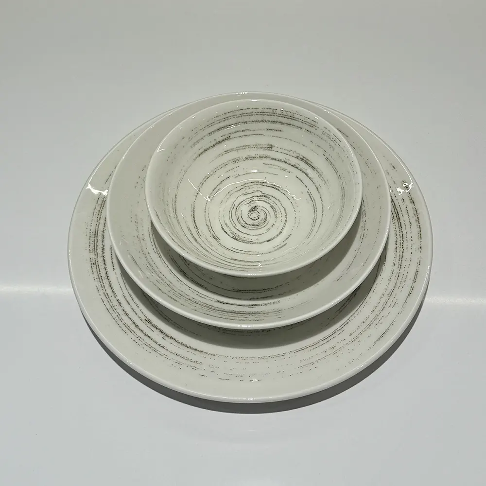 Il design si ispira alle linee concentriche della sabbia modellata dal vento, creando un effetto materico che dona un carattere rustico ma raffinato. Le tonalità neutre e le leggere sfumature permettono al set di adattarsi sia a tavole classiche che moderne.