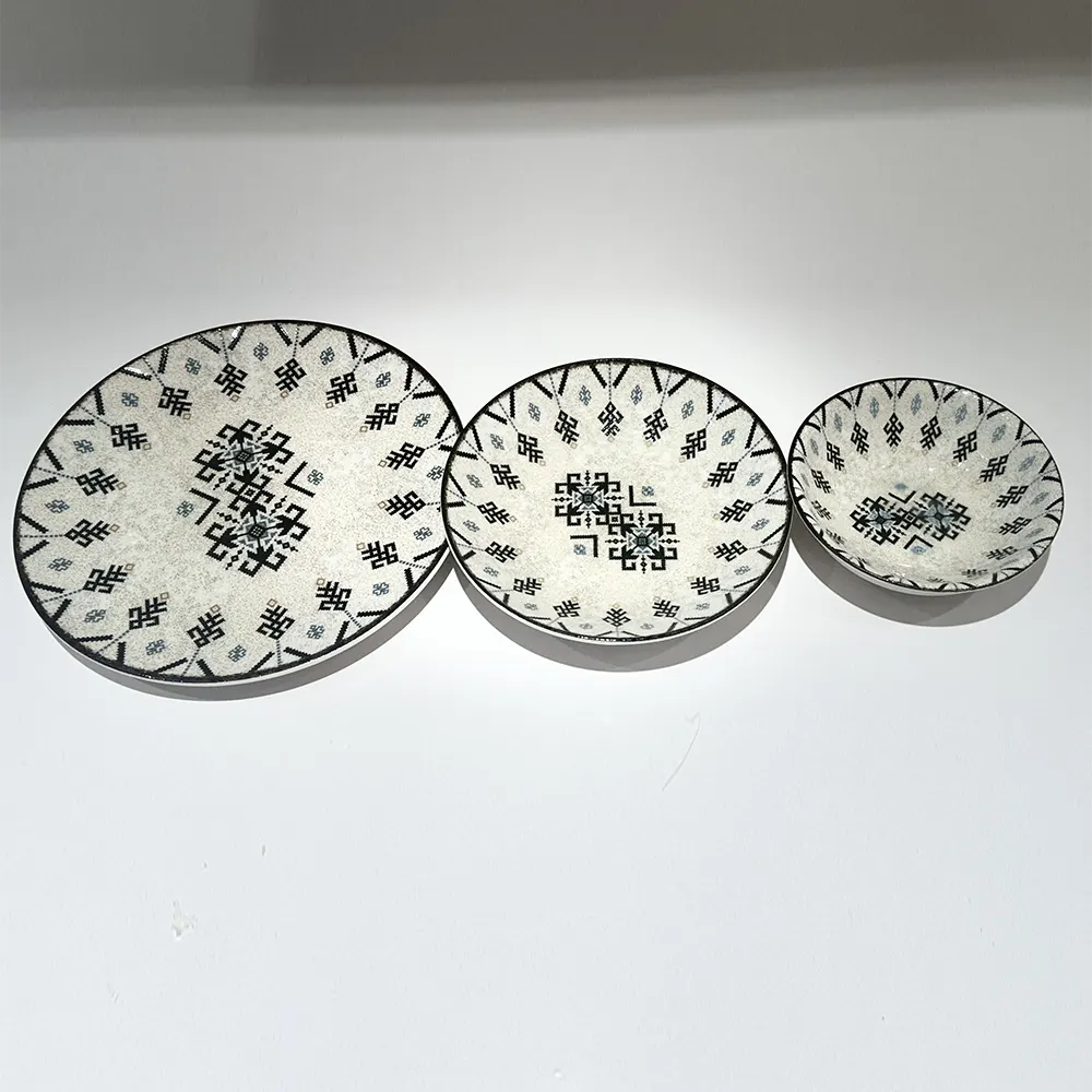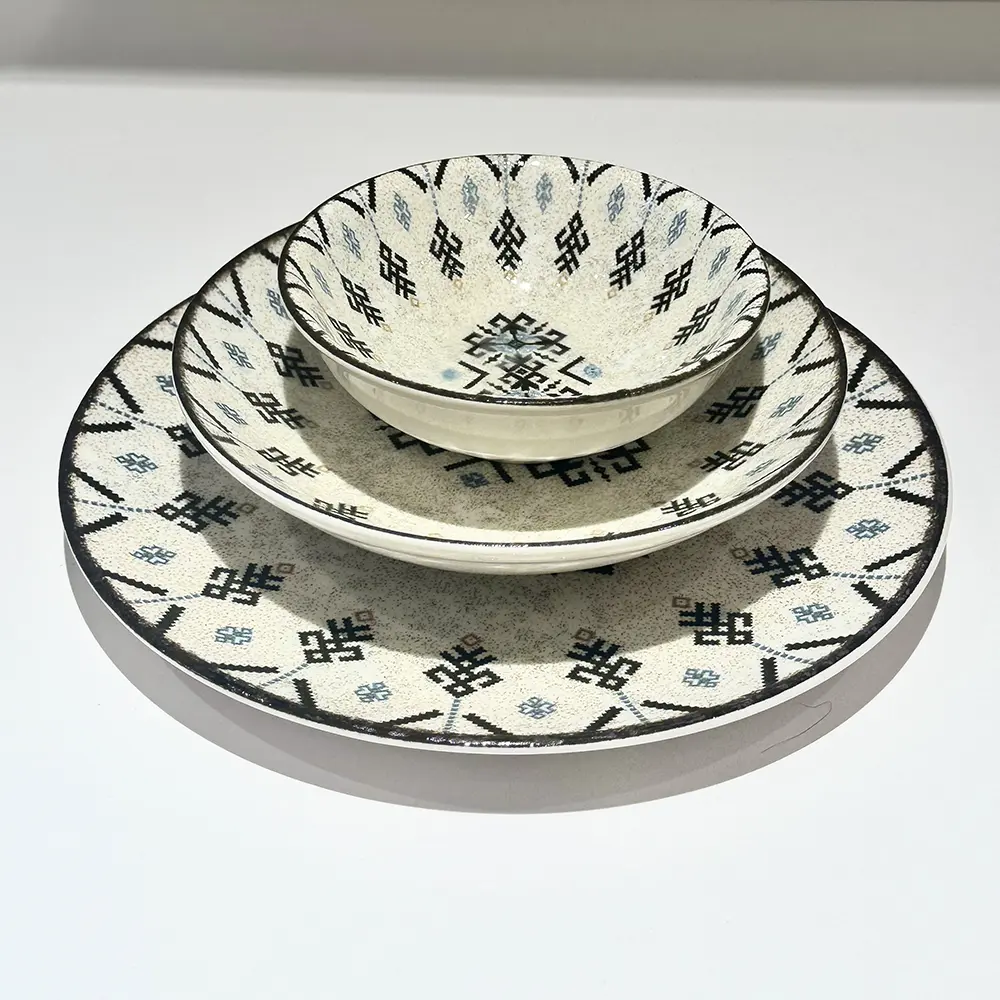Le decorazioni geometriche e i colori delicati in blu e nero, su base beige, creano un effetto visivo affascinante che unisce modernità e tradizione. Il bordo nero che rifinisce ogni pezzo aggiunge un tocco di classe, trasformando i piatti decorati in porcellana in veri protagonisti della tavola.